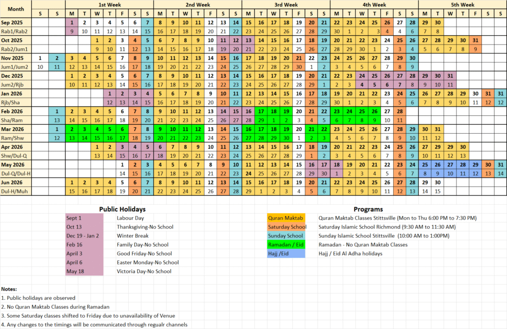Quran Maktab: Monday to Thursday 6:00PM to 7:30PM